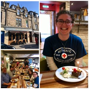 - Inverness dinner @ Encore where we had a mixture of Scottish and contemporary food. Plus we celebrated Rebekah’s birthday who got a Scottish and USA happy birthday song with a candle to blow out on her warm brownie! Happy Birthday Rebekah! We also watched Brazil ?? play Belgium ?? in the World Cup, Belgium won to delight of most Scottish!